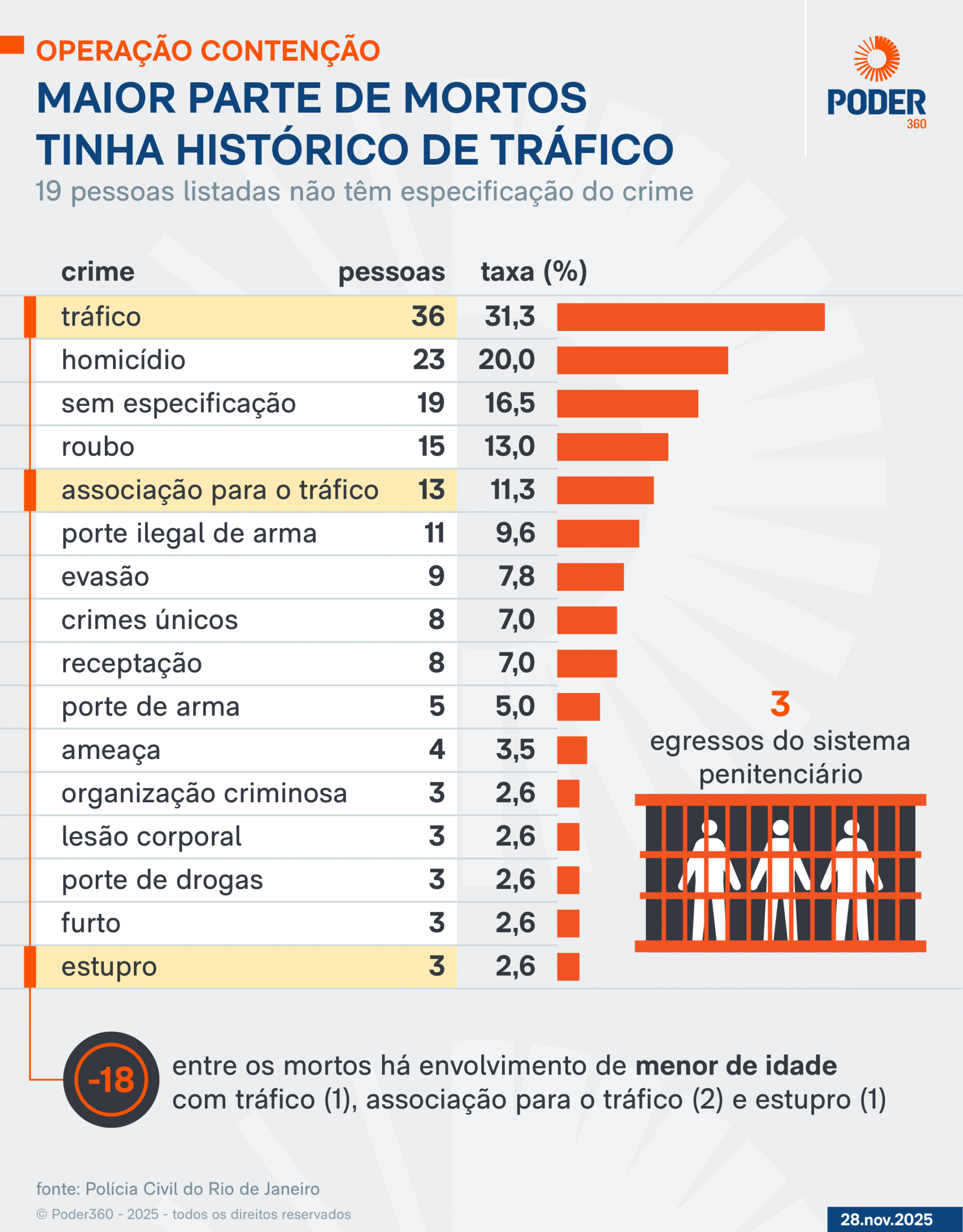A operação Contenção, deflagrada pelas polícias Civil e Militar do Rio de Janeiro, mirou a facção CV (Comando Vermelho). Em 3 de novembro, 6 dias depois da ação, o governo do Estado do Rio de Janeiro enviou ao STF (Supremo Tribunal Federal) um relatório para defender a legalidade da megaoperação. Eis a íntegra (PDF – 3 MB).