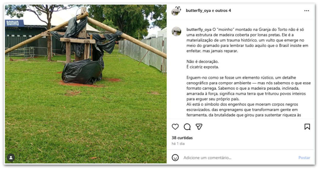 As manifestantes também fizeram uma publicação conjunta nas redes sociais de uma foto que mostra um antigo moinho de açúcar coberto por lonas pretas: “É a materialização de um trauma histórico, um vulto que emerge no meio do gramado para lembrar tudo aquilo que o Brasil insiste em enfeitar, mas jamais reparar. Não é decoração. É cicatriz exposta”.