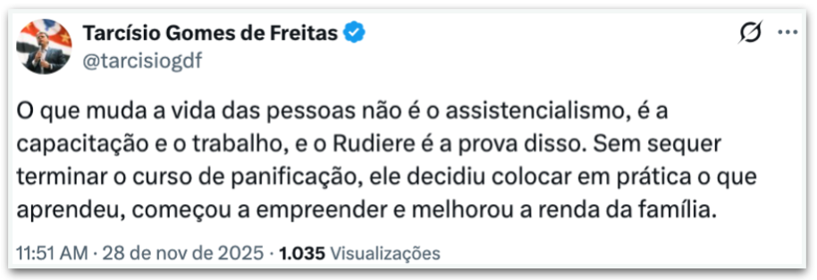 O “assistencialismo” criticado por Tarcísio seria a oferta de benefícios para os mais pobres através, por exemplo, do Bolsa Família, principal bandeira do governo de Luiz Inácio Lula da Silva (PT).