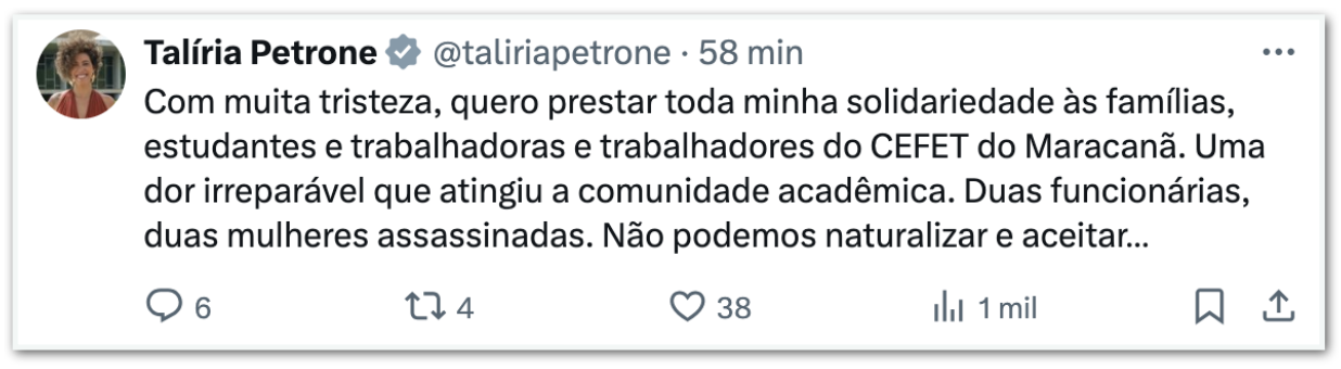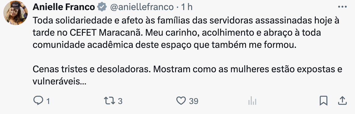 A ministra da Igualdade Racial Anielle Franco (PT) usou as redes sociais para prestar solidariedade às famílias das servidoras, ressaltando que “a comunidade acadêmica” do espaço a formou. Segundo ela, o episódio mostra “como as mulheres estão expostas e vulneráveis”.