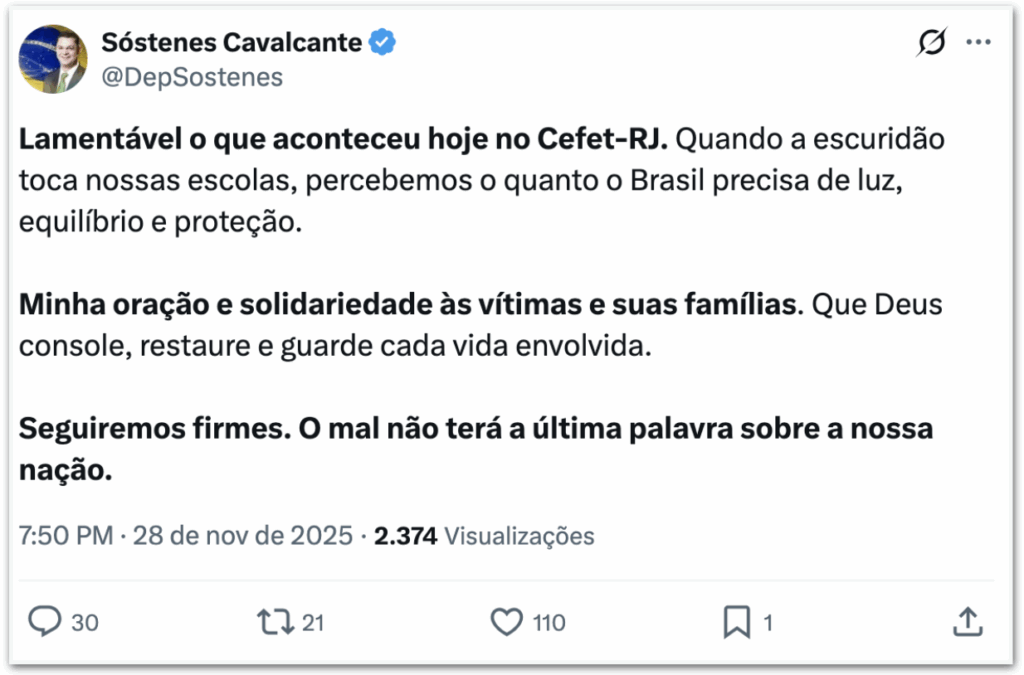 O líder do PL, Sóstenes Cavalcante, afirmou no X que o “Brasil precisa de luz, equilíbrio e proteção” e, em tom religioso, disse que “o mal não terá a última palvra sobre a nossa nação”.