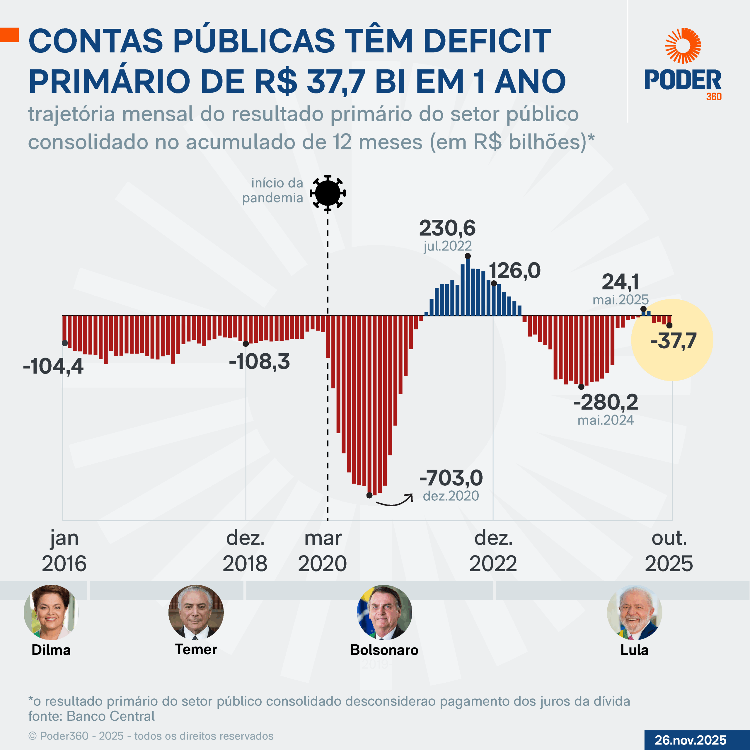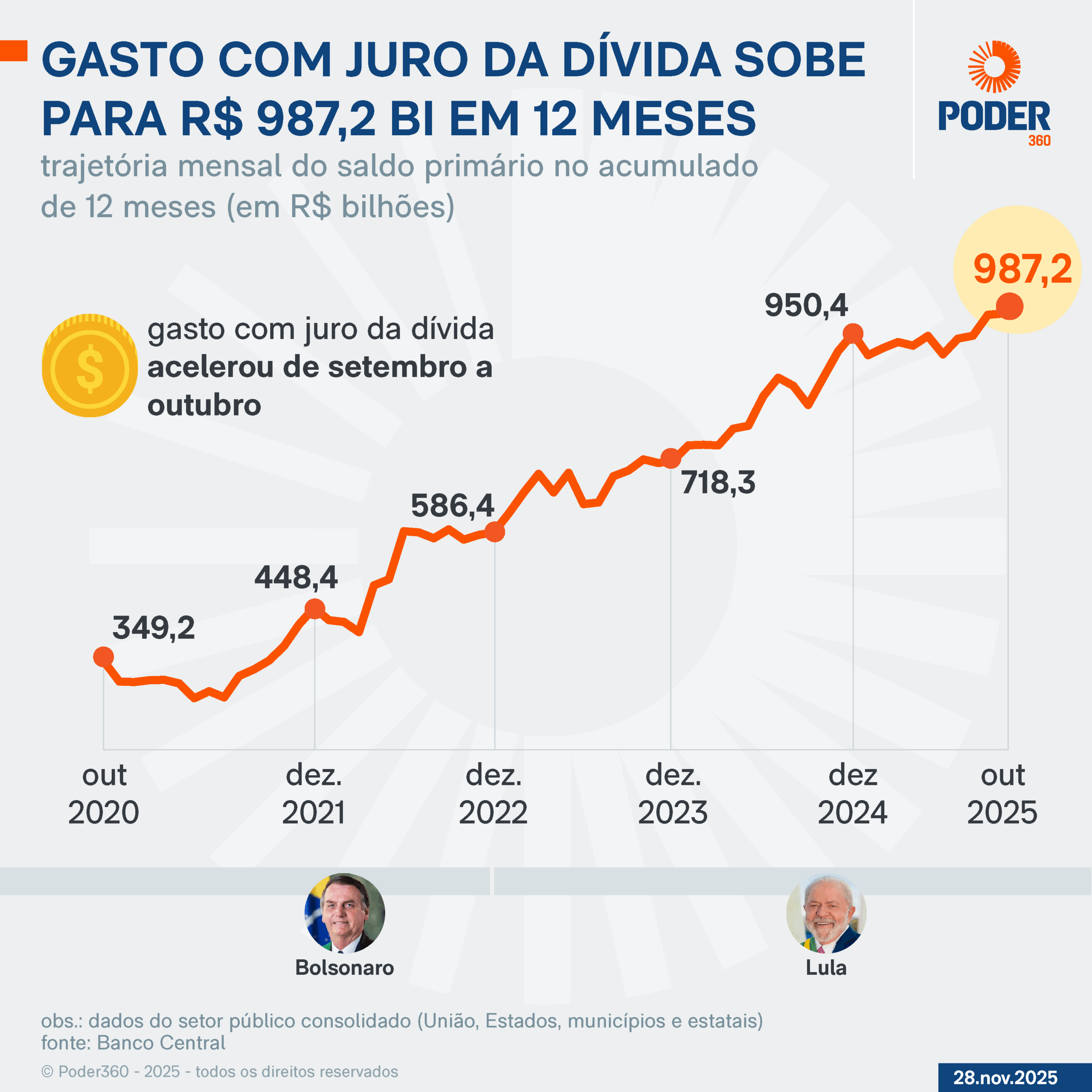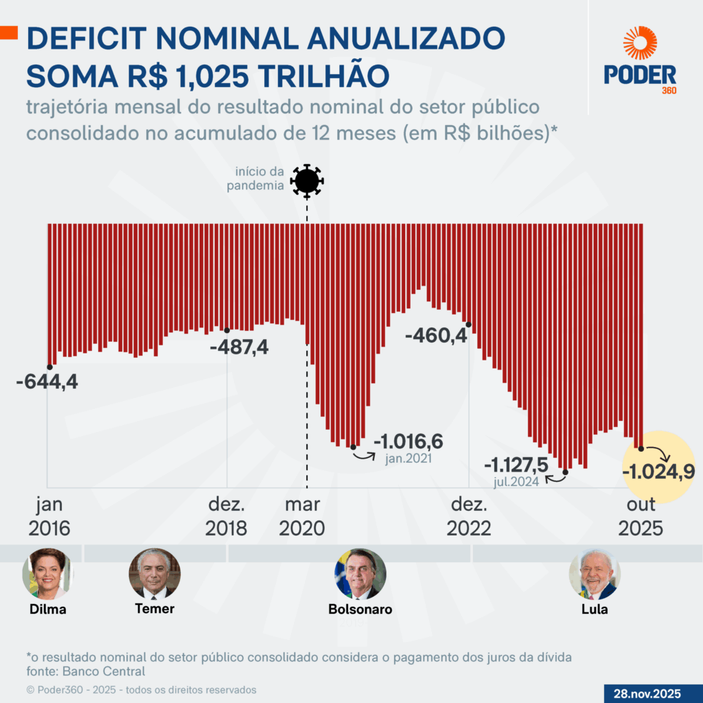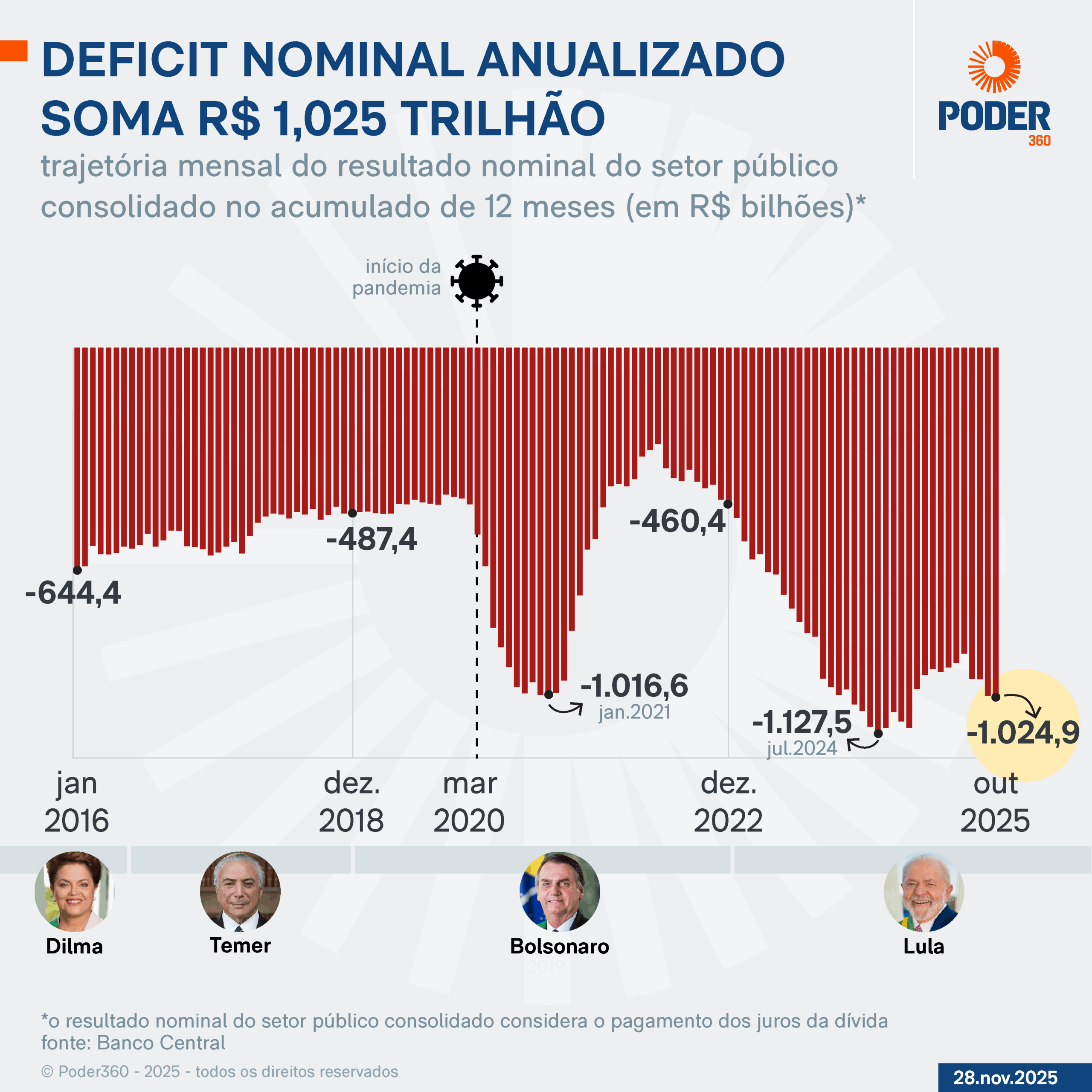 O deficit nominal do setor público consolidado –formado por União, Estados, municípios e estatais– somou R$ 1,025 trilhão no acumulado de 12 meses até outubro. O saldo negativo aumentou 0,7% em termos nominais em relação a setembro. O BC (Banco Central) divulgou o relatório de estatísticas fiscais nesta 6ª feira (28.nov.2025). Eis a íntegra (PDF – 322 kB).