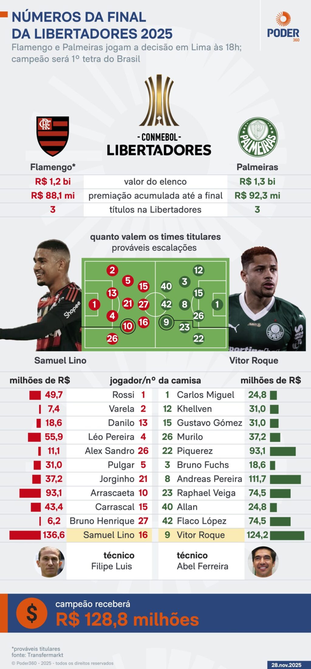 De acordo com o site especializado Transfermarkt, os elencos das duas equipes figuram entre os mais valiosos do continente. O Flamengo é avaliado em aproximadamente 195,90 milhões de euros (R$ 1,2 bilhão, euro cotado a R$ 6,21), enquanto o Palmeiras em 212,15 milhões de euros (R$ 1,3 bilhão).