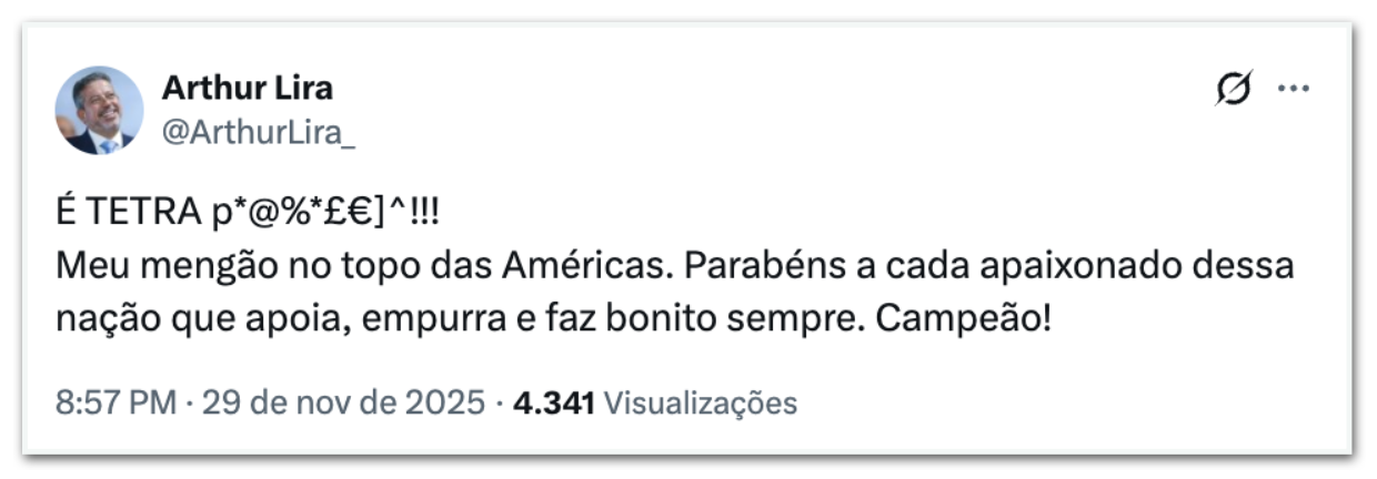 O deputado e ex-presidente da Câmara, Arthur Lira (PP-AL), comemorou o fato de o “Mengão” estar no topo das Américas. Recorreu a caracteres especiais para não escrever nenhum palavrão em sua publicação.