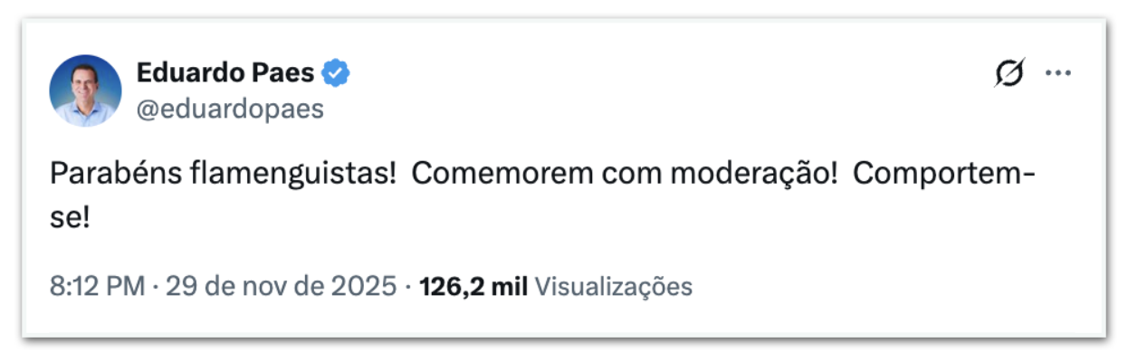 O prefeito do Rio, Eduardo Paes (PSD), pediu aos flamenguistas que comemorassem com moderação. Mais cedo neste sábado (29.nov), Paes postou um vídeo com uma pegadinha ao marcar uma reunião com os secretários bem na hora da final. Depois, disse que era uma brincadeira.