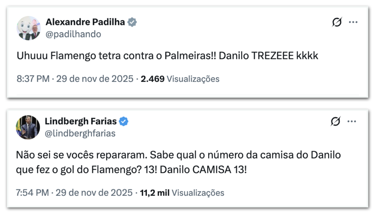 Torcedor do Corinthians, o ministro da Saúde, Alexandre Padilha, aproveitou a vitória do Flamengo para afirmar que o autor do gol do título, Danilo, veste a camisa 13. O deputado e líder do PT na Câmara, Lindbergh Farias (PT-RJ), fez o mesmo.