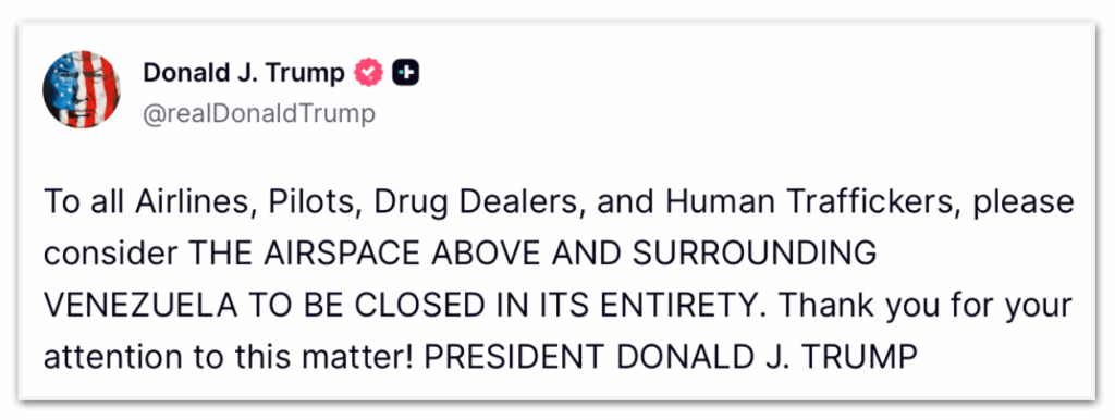 “A todas as companhias aéreas, pilotos, traficantes de drogas e traficantes de pessoas, por favor considerem O ESPAÇO AÉREO ACIMA E AO REDOR DA VENEZUELA COMO TOTALMENTE FECHADO. Obrigado pela atenção!”, escreveu Trump na rede social Truth Social.