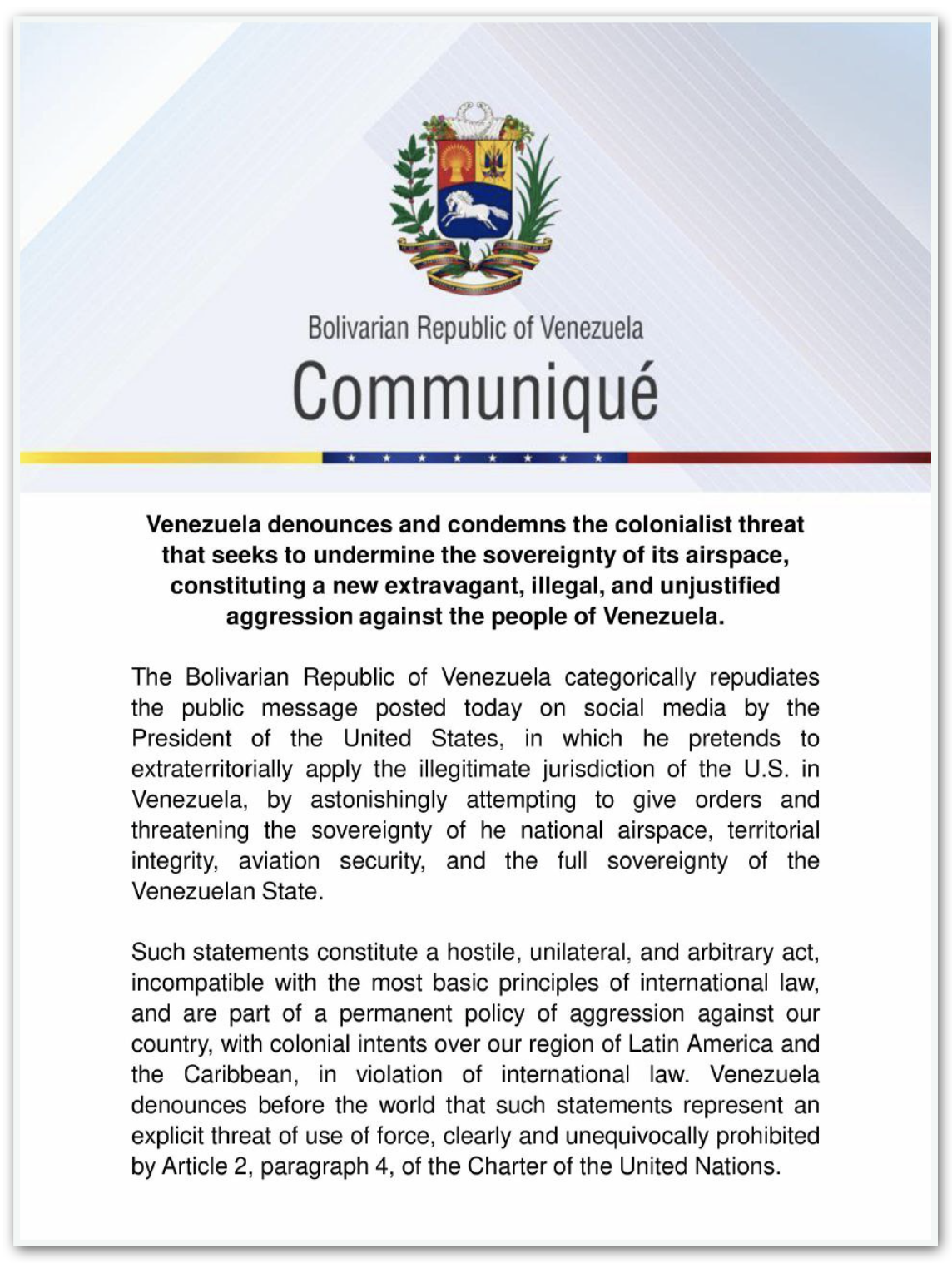 Segundo Caracas, a mensagem de Trump representa uma tentativa de aplicar de forma extraterritorial a jurisdição norte-americana, em violação ao direito internacional. O governo citou a Convenção de Chicago, que estabelece que cada país tem “soberania absoluta” sobre o espaço aéreo do seu território.