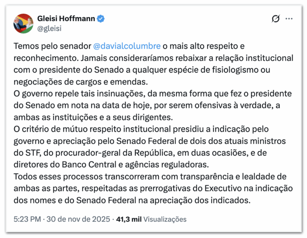A mensagem postada pela ministra em seu perfil no X é uma resposta à nota divulgada por Alcolumbre mais cedo. O presidente do Senado havia dito que há uma “tentativa de setores do Executivo” de dar contornos fisiológicos a eventuais divergências entre os Poderes. Segundo ele, trata-se de uma tentativa de criar “a falsa impressão” de que conflitos institucionais se resolvem “com cargos e emendas”.