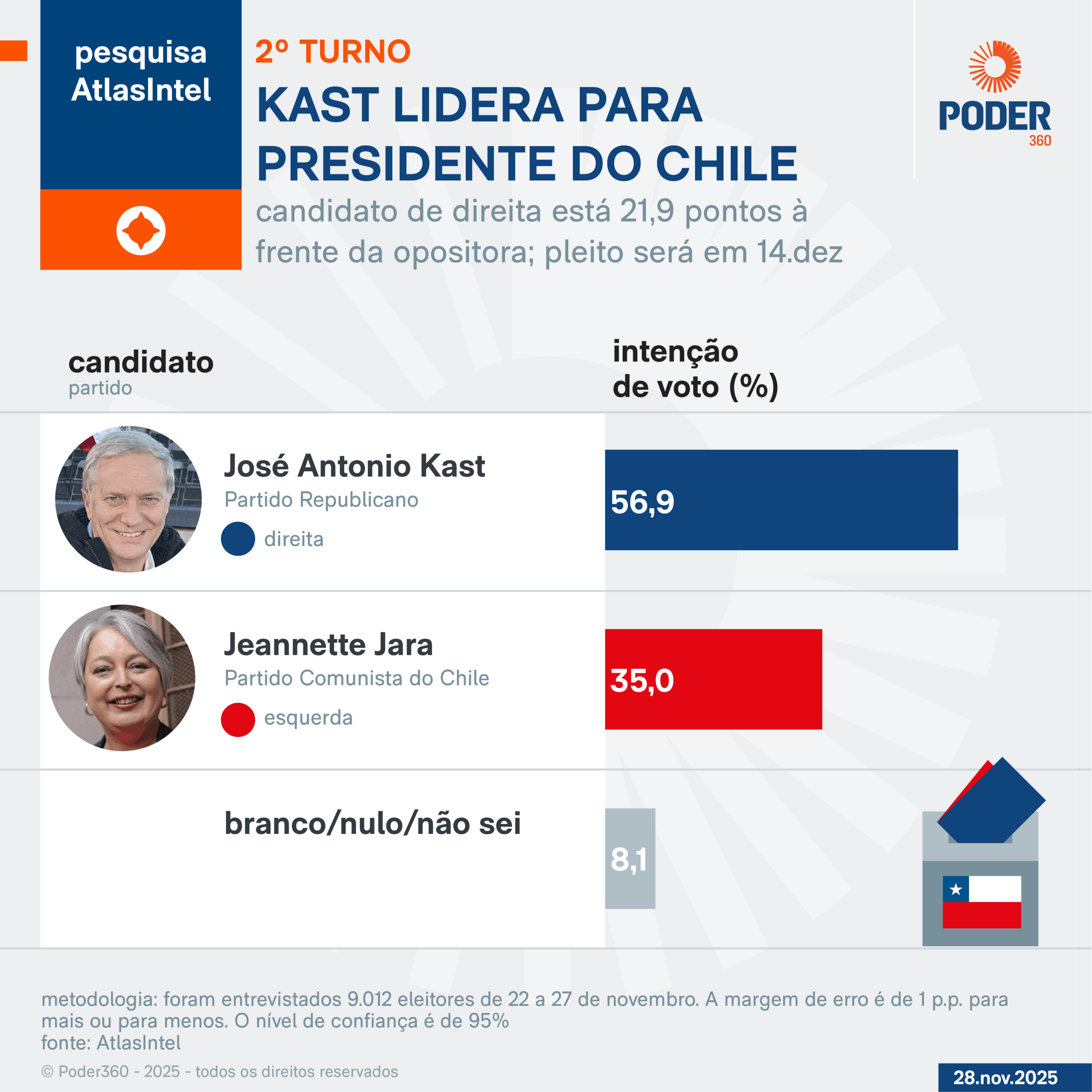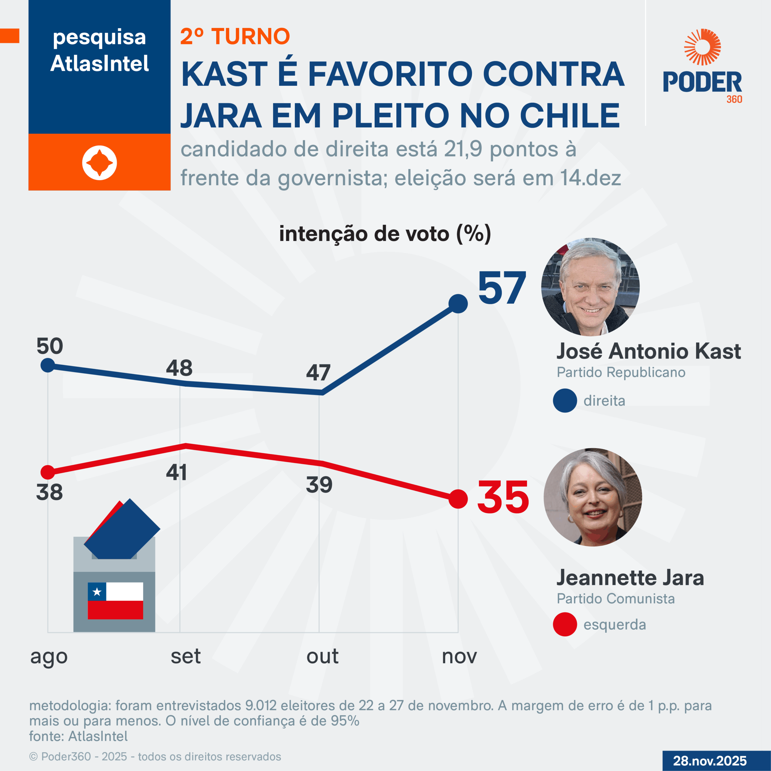 Os levantamentos têm registrado vantagem de Kast no 2º turno desde o começo da disputa. Essa projeção favorável do candidato é um reflexo das dificuldades do atual presidente, Gabriel Boric (Frente Ampla, esquerda) em cumprir as promessas de seu mandato, como a reforma da Constituição, que continua a mesma desde a ditadura de Augusto Pinochet (1915-2006), que governou o país de 1973 a 1990.