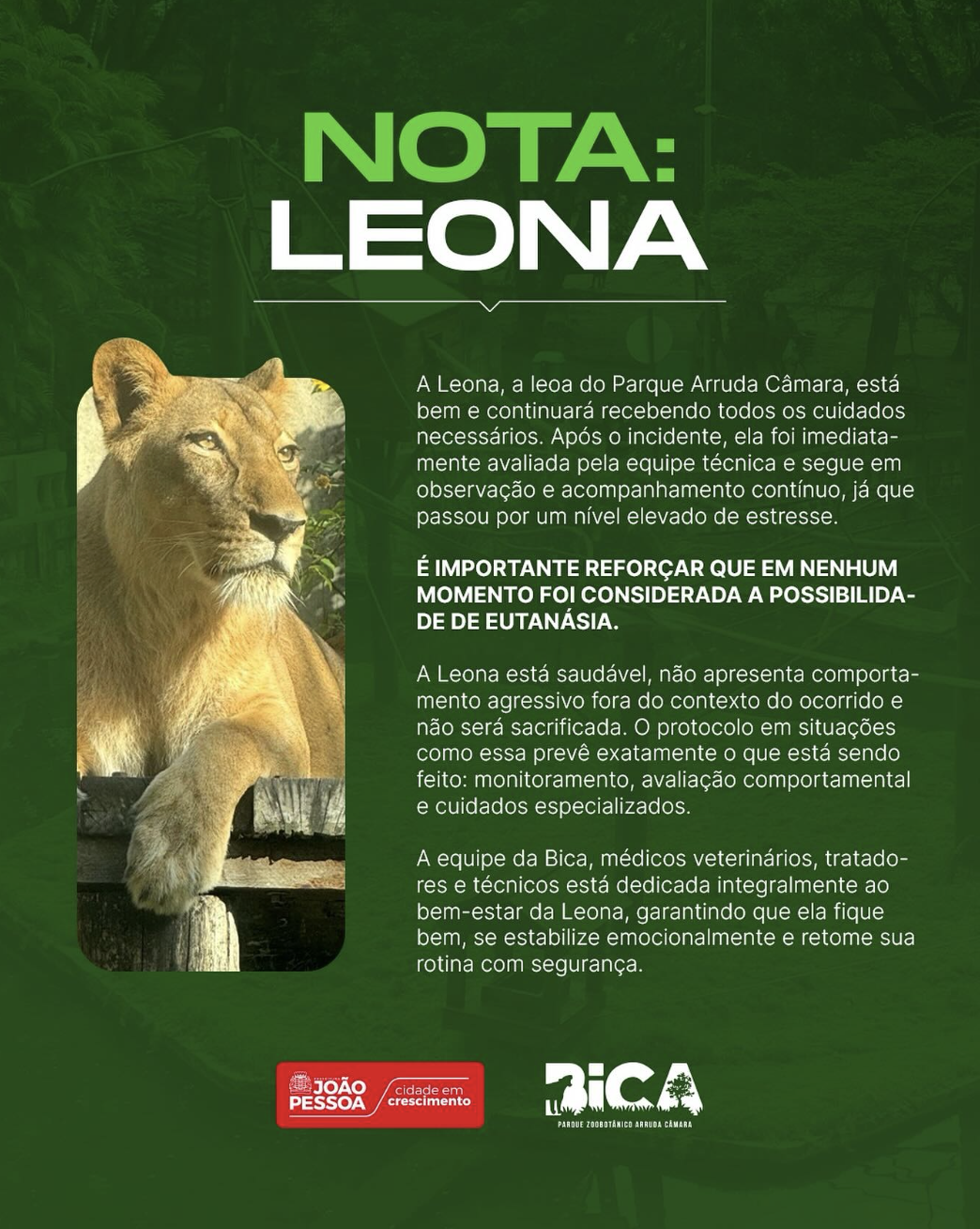 O zoológico disse que a leoa, chamada Leona, “está bem e continuará recebendo todos os cuidados necessários”. Afirmou também que o animal “passou por um nível elevado de estresse” e que “em nenhum momento foi considerada a possibilidade de eutanásia”.