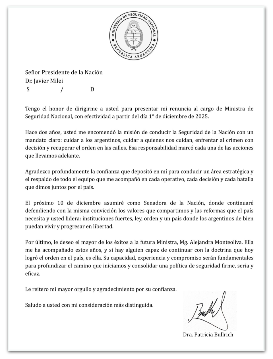 Bullrich estava no cargo desde o início do governo Milei, em dezembro de 2023. Vai assumir uma vaga no Senado em 10 de dezembro de 2025 e será a líder do partido de Milei, La Libertad Avanza, na Casa Alta. No governo, será substituída por Alejandra Monteoliva, secretária de Segurança Nacional.