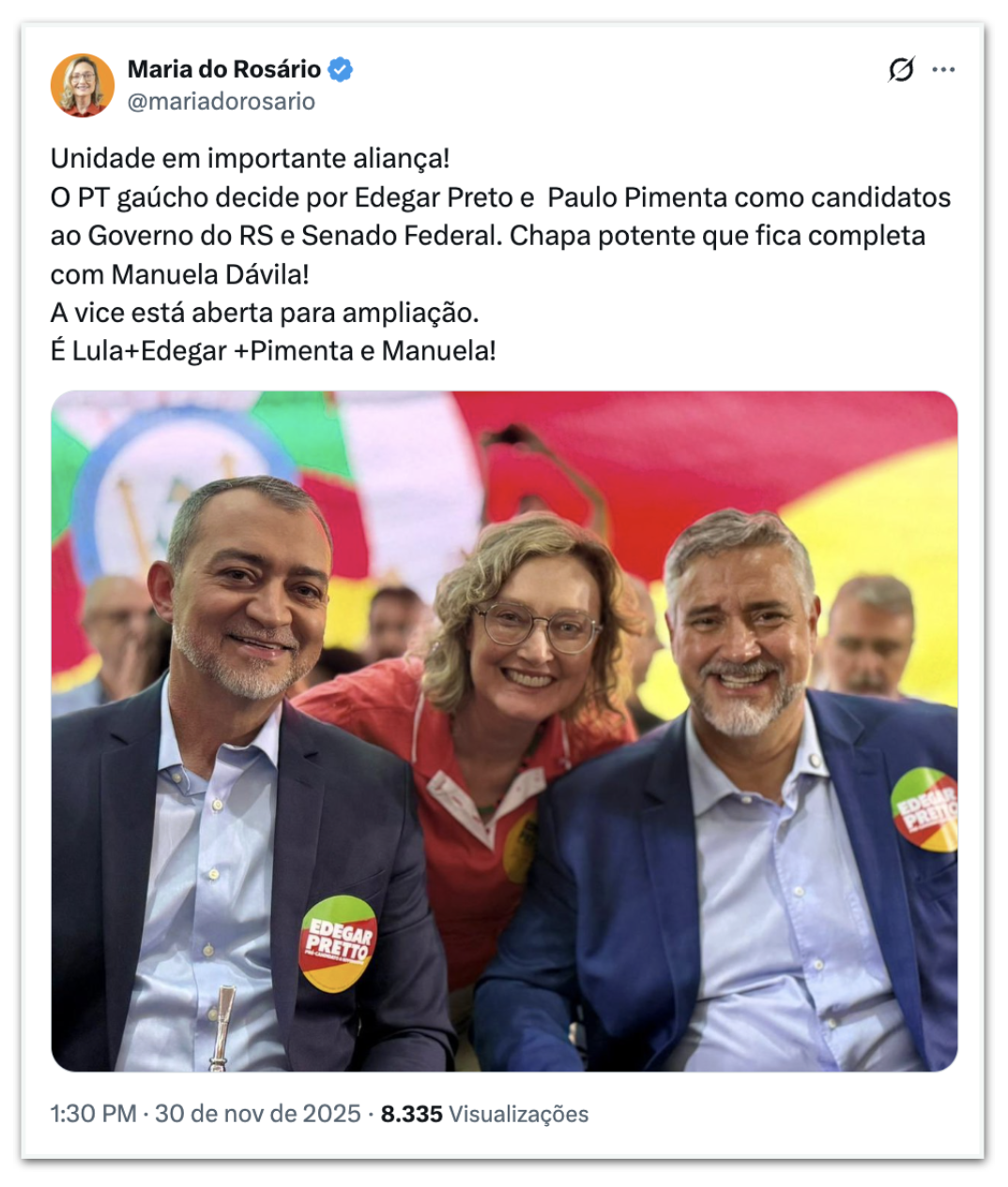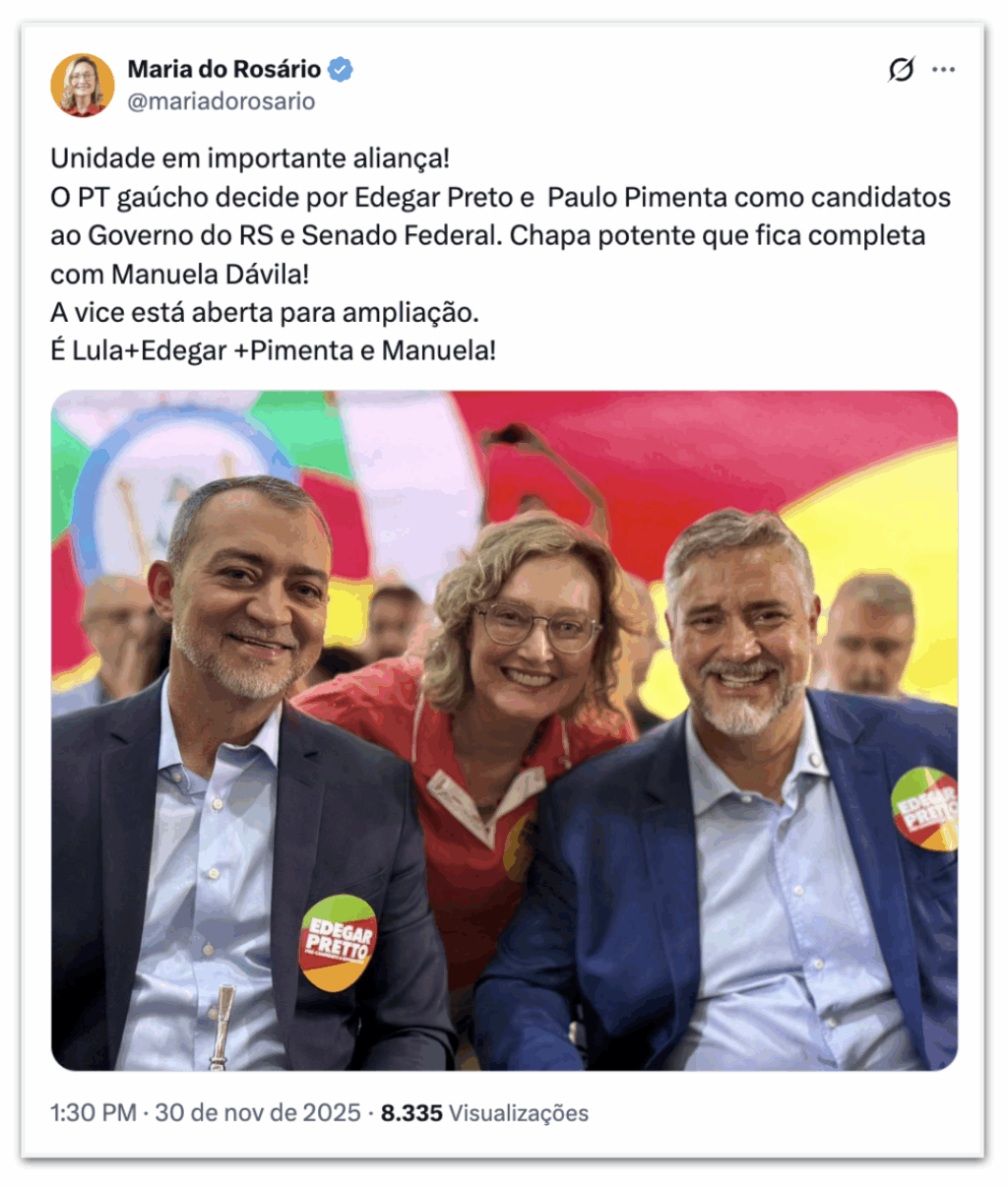 Maria do Rosário afirmou também que o cargo de vice-governador na chapa de Pretto está aberto e que o partido irá apoiar a candidatura da ex-deputada Manuela D’Ávila para o Senado. Atualmente sem partido, Manuela vai se filiar ao Psol em 9 de dezembro.
