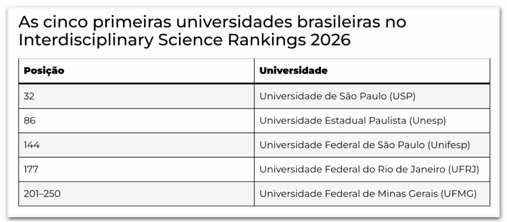 Lançado em 2025, o levantamento chega a 2ª edição tendo como principal novidade justamente a ampliação do escopo para incluir colaborações entre disciplinas científicas e ciências sociais, educação, psicologia, direito, economia, saúde e ciências clínicas. Além disso, a participação cresceu: foram analisadas 911 universidades de 94 países, aumento de 22% em relação à edição anterior.