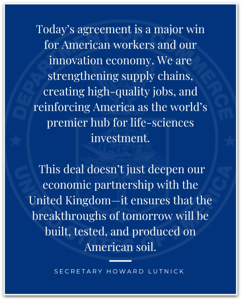 O Departamento de Comércio divulgou um comunicado em que classifica o acordo como “uma grande vitória dos trabalhadores e da economia de inovação”. Segundo a nota, o anúncio “não apenas aprofunda a parceria com o Reino Unido, mas garante que os avanços do amanhã serão construídos, testados e produzidos em solo norte-americano”.