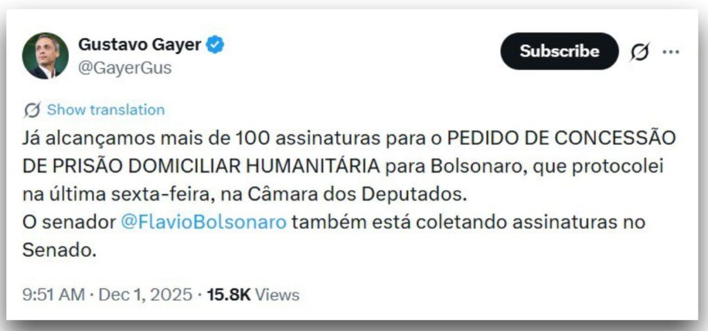 O deputado federal Gustavo Gayer (PL-GO) anunciou nesta 2ª feira (1º.dez.2025) que conseguiu mais de 100 assinaturas de congressistas para o pedido de prisão domiciliar humanitária do ex-presidente Jair Bolsonaro (PL). O documento foi protocolado no STF (Supremo Tribunal Federal) na 6ª feira (28.nov.2025). Gayer acrescentou que o senador Flávio Bolsonaro (PL-RJ) também coleta assinaturas no Senado.