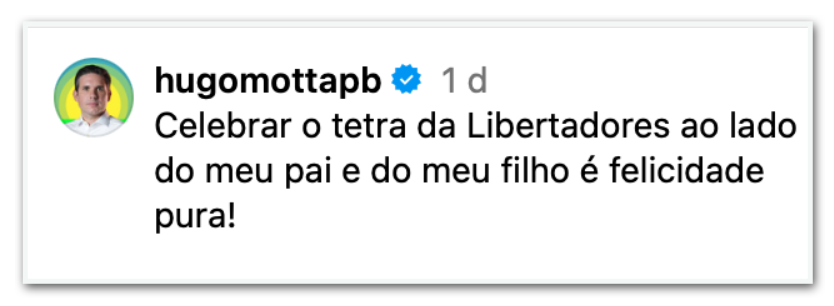 O presidente da Câmara, Hugo Motta (Republicanos-PB), comemorou o título da Copa Libertadores 2025 no Instagram. Ele esteve no sábado (29.nov.2025) em Lima, no Peru, com o filho e o pai, todos flamenguistas.