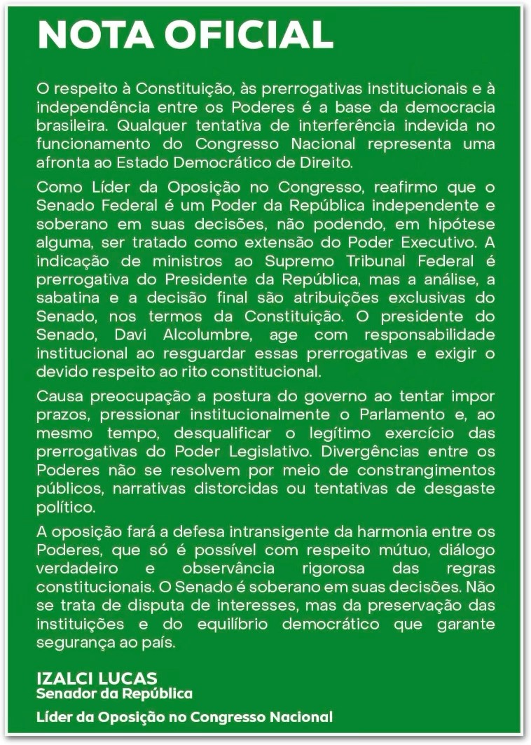O líder da oposição no Congresso Nacional, senador Izalci Lucas (PL-DF), afirmou nesta 2ª feira (1º.dez.2025) que há “interferência indevida no funcionamento do Congresso Nacional” diante da disputa entre o Senado e o Planalto sobre a indicação de Jorge Messias ao STF (Supremo Tribunal Federal). Em nota, o senador declarou que o respeito às prerrogativas do Legislativo é “a base da democracia brasileira” e disse que o Senado “não pode ser tratado como extensão do Poder Executivo”, em referência às pressões do governo para acelerar a análise do indicado pelo presidente Luiz Inácio Lula da Silva (PT).