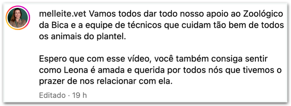 “Vamos todos dar todo nosso apoio ao Zoológico da Bica e a equipe de técnicos que cuidam tão bem de todos os animais do plantel. Espero que com esse vídeo, você também consiga sentir como Leona é amada e querida por todos nós que tivemos o prazer de nos relacionar com ela”, escreveu a veterinária em seu perfil no Instagram.