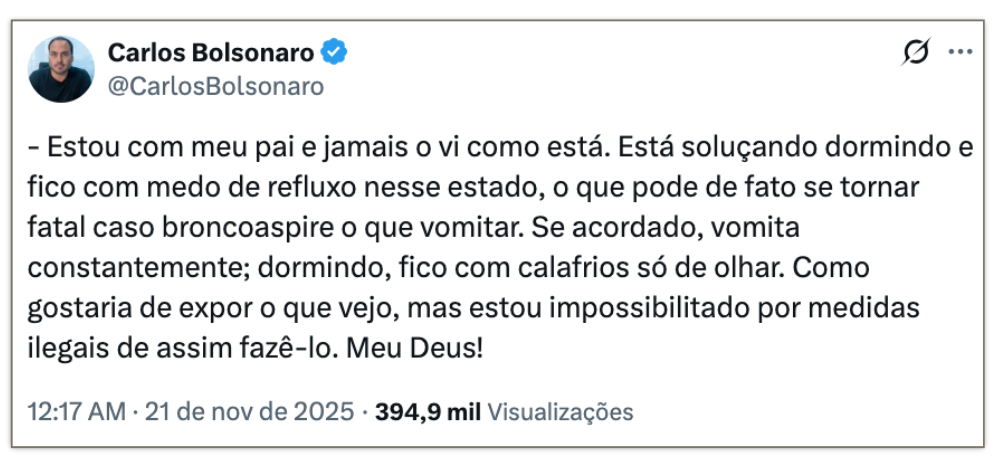 O vereador do Rio Carlos Bolsonaro (PL-RJ) afirmou em postagem no X em 21 de novembro que o estado de saúde do pai piorou. Na publicação, disse que o ex-chefe do Executivo “vomita constantemente” quando está acordado e tem episódios de soluços quando está dormindo.
