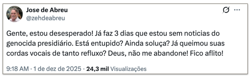 “Gente, estou desesperado! Já faz 3 dias que estou sem notícias do genocida presidiário”, escreveu o artista no X (antigo Twitter). Abreu também fez comentários satíricos sobre o estado de saúde de Bolsonaro, que de acordo com seus filhos, piorou. “Está entupido? Ainda soluça? Já queimou suas cordas vocais de tanto refluxo?”