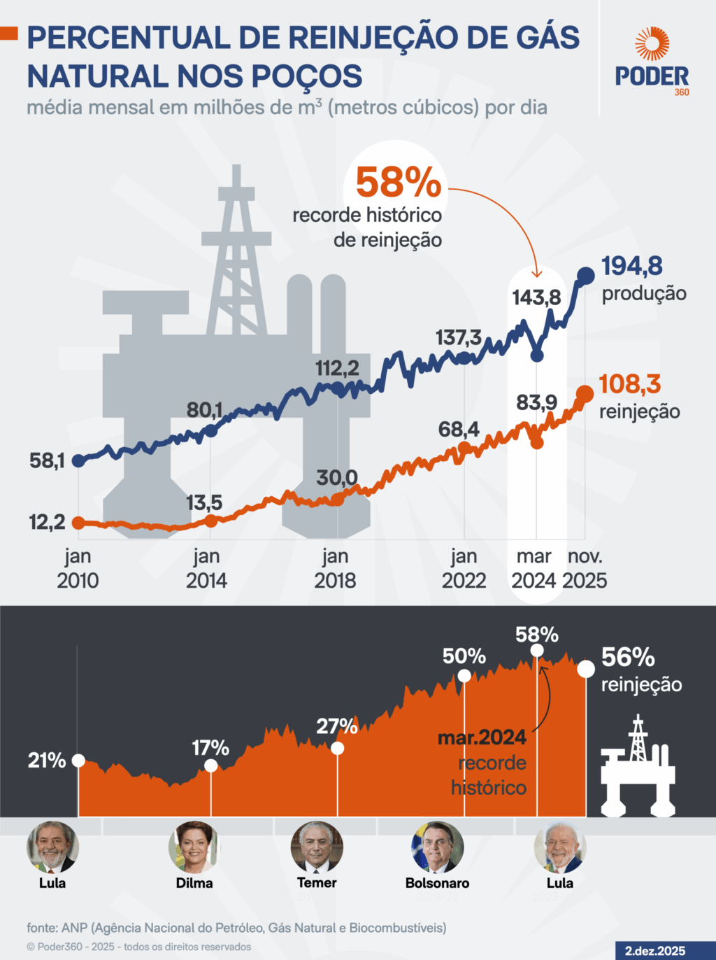 A prática da reinjeção tem se intensificado desde 2015, especialmente em campos offshore da Bacia de Campos e da Bacia de Santos, onde a compressão do gás ajuda a manter a pressão natural dos reservatórios, segundo a ANP.