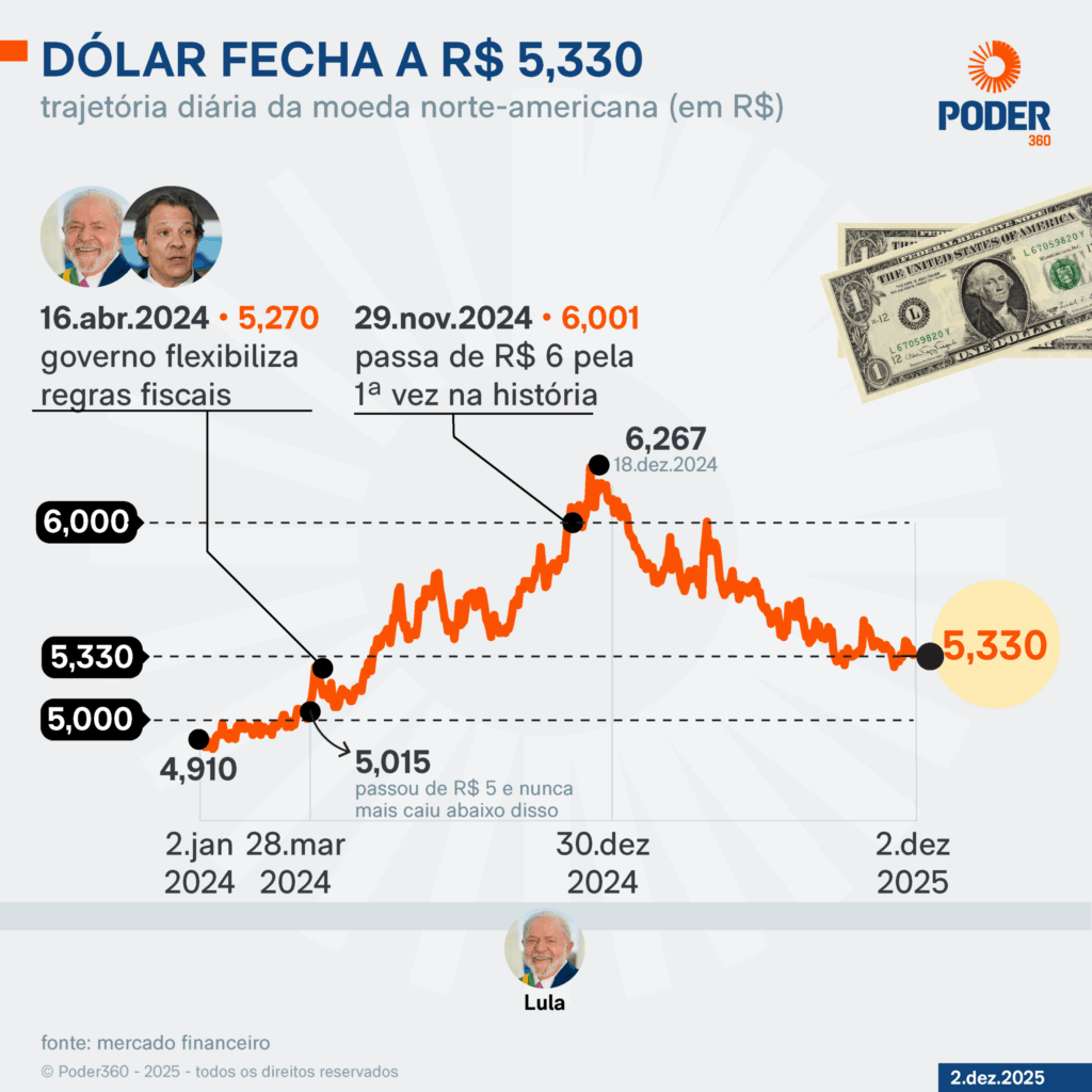 O dólar comercial fechou aos R$ 5,330 nesta 3ª feira (2.dez.2025), com queda de 0,52%. A moeda norte-americana atingiu R$ 5,329 na mínima e R$ 5,363 na máxima. O Ibovespa, principal índice da B3 (Bolsa de Valores de São Paulo), registrou o recorde nominal, após superar 160 mil pontos pela 1ª vez na história. ÀS 17h08, estava aos 160.660 pontos, com alta de 1,29%.