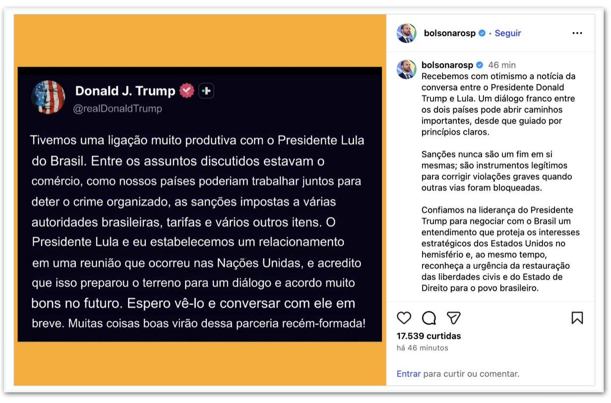 “Recebemos com otimismo a notícia da conversa entre o presidente Donald Trump e Lula. Um diálogo franco entre os 2 países pode abrir caminhos importantes, desde que guiado por princípios claros”, publicou.