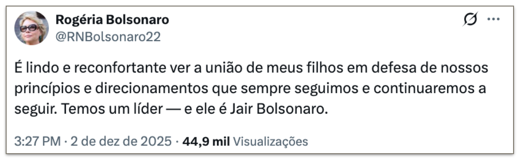 Já o vereador do Rio Carlos Bolsonaro (PL), que havia se aproximado mais de Michelle depois da prisão de seu pai, afirmou que Flávio “está certo e temos que estar unidos e respeitando a liderança do meu pai, sem deixar nos levar por outras forças!”.