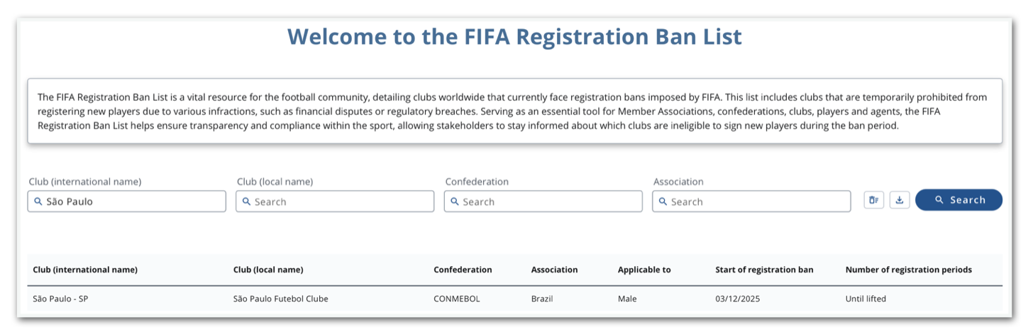 A sanção atinge o São Paulo no período pós-temporada. Com o calendário de 2025 encerrado, o clube tem aproximadamente um mês para resolver a questão antes da abertura da próxima janela de transferências da CBF (Confederação Brasileira de Futebol), que funcionará de 5 de janeiro a 3 de março de 2026.