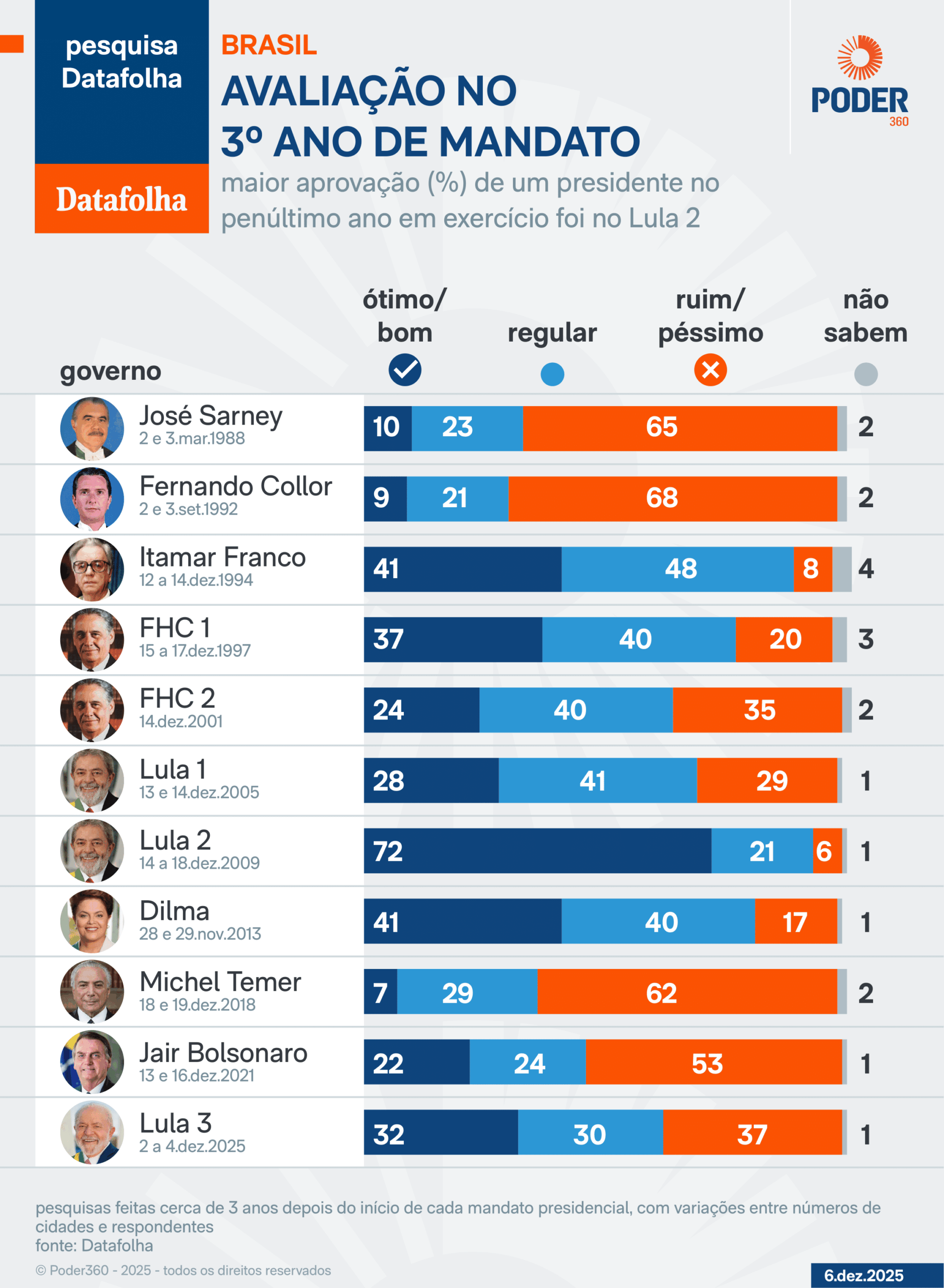 A mais recente pesquisa Datafolha, divulgada na 6ª feira (5.dez.2025), mostra o governo Lula com 32% de avaliação positiva (“ótimo” ou “bom”) contra 37% de avaliação negativa (“ruim” ou “péssimo”) —uma diferença de 5 pontos percentuais. O levantamento ouviu 2.002 eleitores em 113 cidades entre 2 e 4 de dezembro.