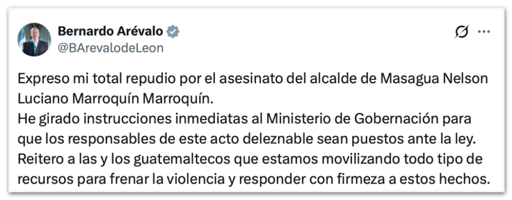 O presidente da Guatemala, Bernardo Arévalo de León (Movimiento Semilla, centro-esquerda), declarou na rede social X, no domingo (7.dez), seu “total repúdio” ao assassinato do prefeito.
