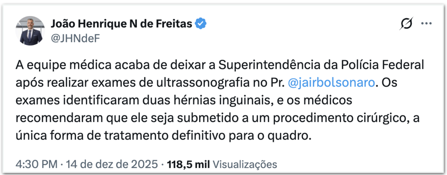 “A equipe médica acaba de deixar a Superintendência da Polícia Federal após realizar exames de ultrassonografia no Pr. @jairbolsonaro. Os exames identificaram duas hérnias inguinais, e os médicos recomendaram que ele seja submetido a um procedimento cirúrgico, a única forma de tratamento definitivo para o quadro”, escreveu no X.