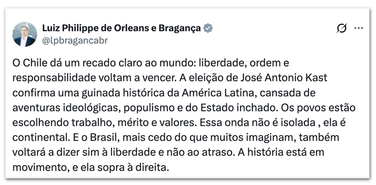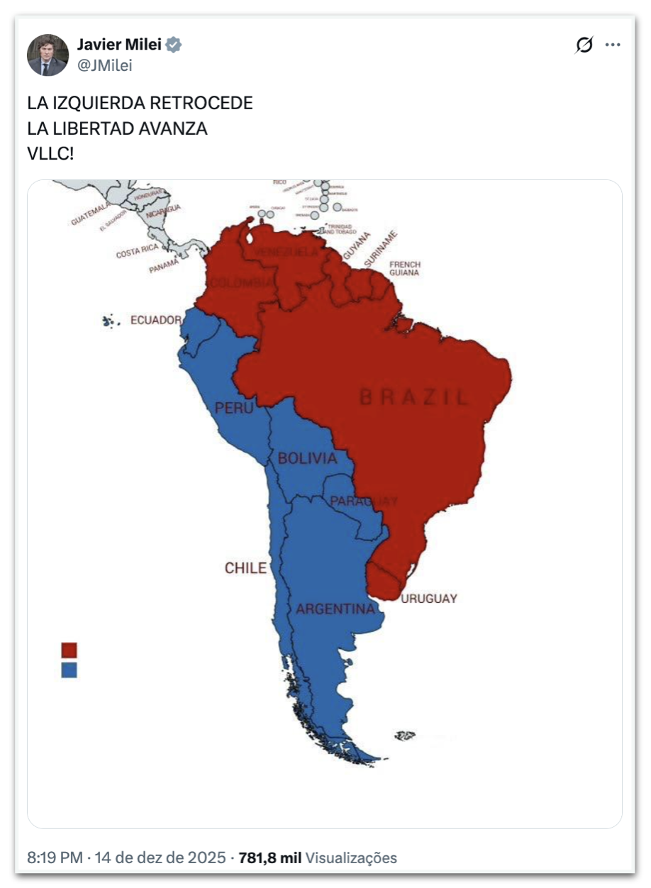 O presidente da Argentina, Javier Milei (La Libertad Avanza), também usou as redes sociais para dar os parabéns ao novo presidente chileno. “LA IZQUIERDA RETROCEDE” (a esquerda retrocede, em português), escreveu o mandatário.