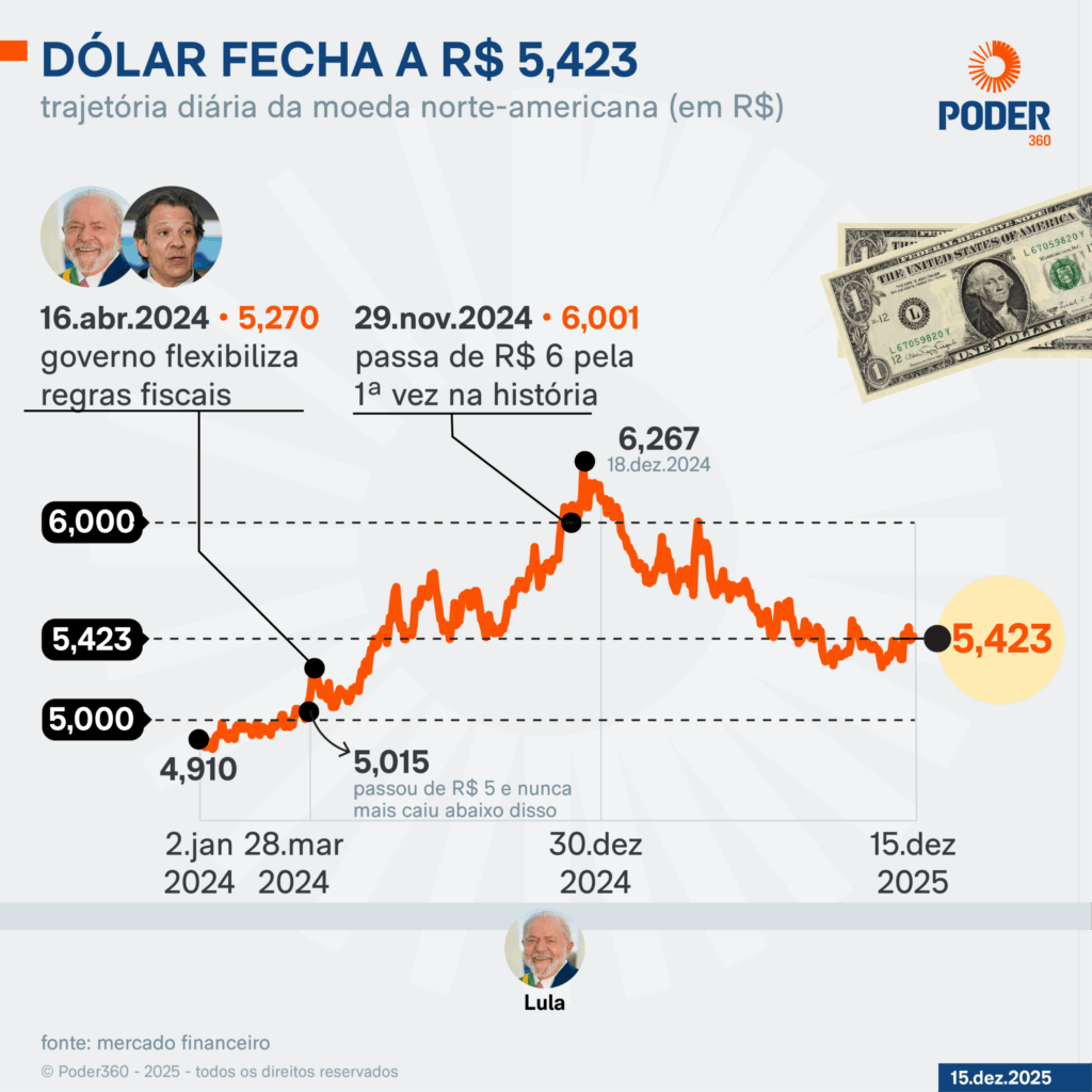 O dólar à vista fechou em alta de 0,23%, cotado em R$ 5,423, após oscilar entre a mínima de R$ 5,381 e a máxima de R$ 5,425. A moeda norte-americana refletiu tanto fatores externos –como cautela em relação ao crescimento global e às decisões do Federal Reserve (banco central dos EUA)– quanto a leitura de indicadores internos mais fracos.