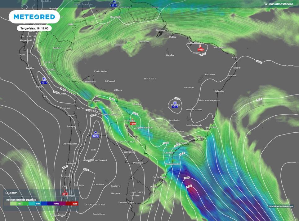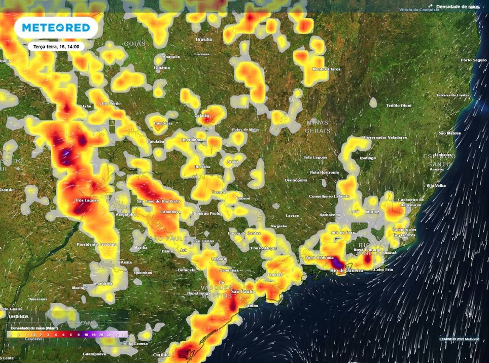 A atuação conjunta de uma nova frente fria próximo à costa da Região Sudeste com um corredor de umidade vindo da região Amazônica vão reforçar as condições para chuvas intensas, tempestades, descargas elétricas (raios), rajadas de vento e até possível queda de granizo no Sudeste do país entre a terça-feira (16) e a quarta-feira (17).