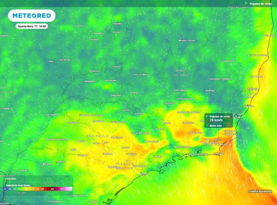 Mas é na quarta-feira (17) que os ventos ficam mais abrangentes. As rajadas alcançam os 60 km/h em São Paulo, especialmente em áreas do interior, e no sudeste de Minas Gerais; e podem chegar aos 70 km/h no Rio de Janeiro.