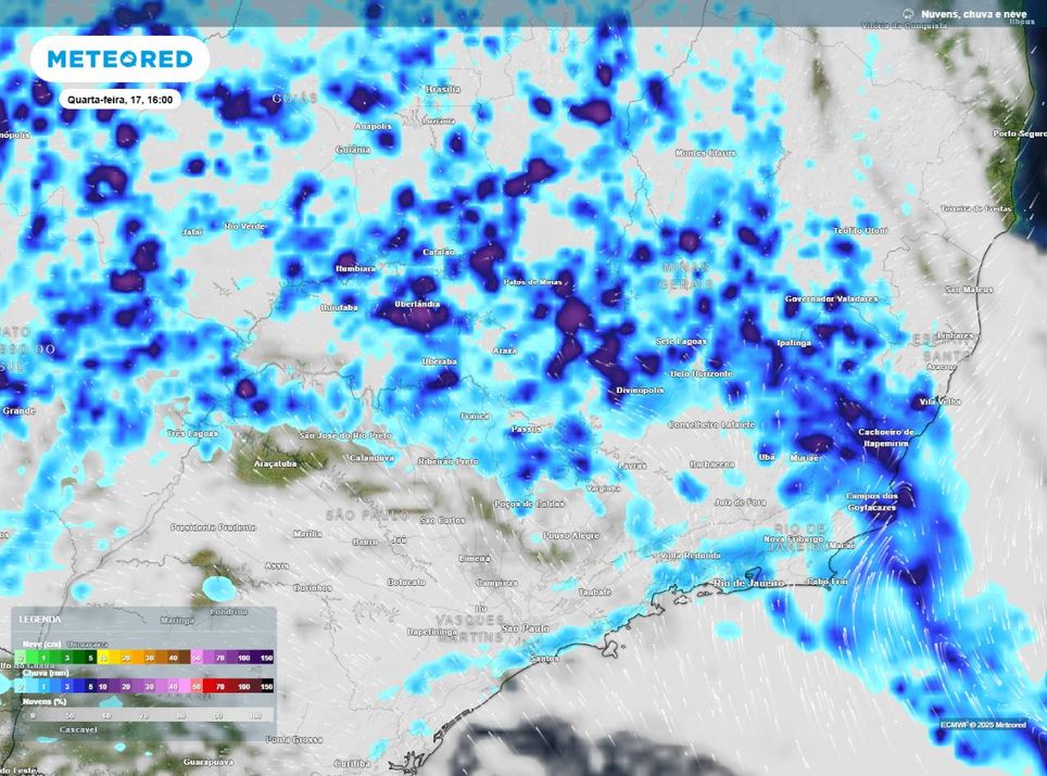 Durante a tarde de quarta-feira (17), as instabilidades ganham força e aumentam as condições para chuvas de até forte intensidade e tempestades em grande parte de Minas Gerais (exceção do norte mineiro), no centro-norte do Rio de Janeiro e no sul do Espírito Santo.