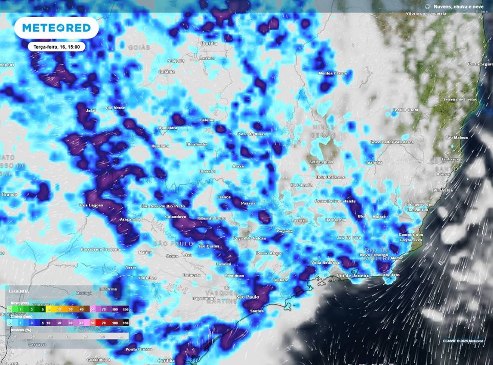 Durante a noite de terça (16), pancadas de chuva e tempestades ainda podem acontecer, mas de forma mais isolada, e especialmente nos estados mineiro e carioca.