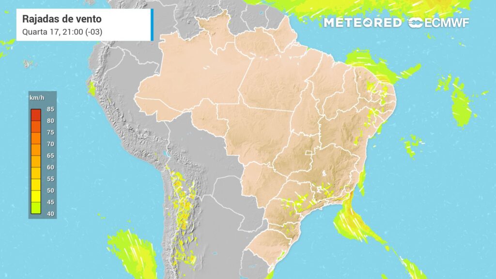 Os ventos podem chegar ou superar 50 km/h em Pelotas/RS, Caxias do Sul/RS e na Região Metropolitana de Porto Alegre/RS. Em Santa Catarina, as rajadas atingem o leste do estado, com até 63 km/h em Florianópolis/SC, variando entre 40 e 50 km/h no restante do litoral.