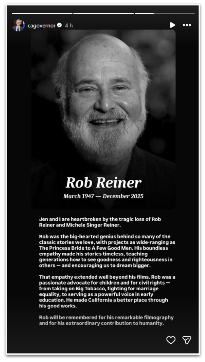 Newsom e Bass lamentaram as mortes e destacaram a relevância do cineasta e ativista para a cultura e a vida pública do Estado. O governador disse estar “de coração partido” com a perda e descreveu Reiner como uma figura decisiva do cinema norte-americano, responsável por obras marcantes e por uma atuação pública guiada pela empatia, pela defesa dos direitos civis e pelo incentivo a causas sociais, como a igualdade no casamento e políticas de apoio à primeira infância.