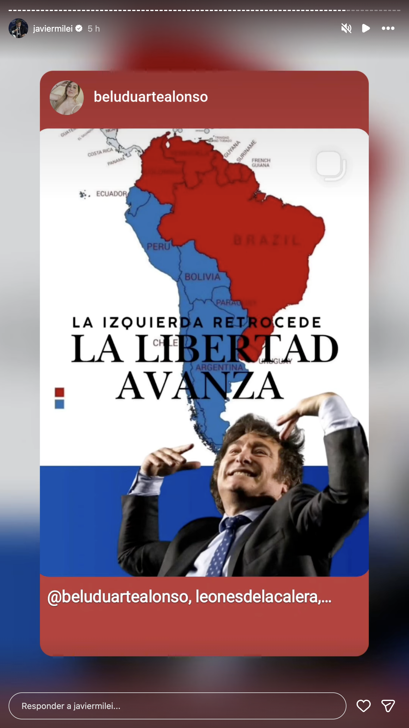 O chefe da Casa Rosada também repostou outra publicação, na qual afirma que “a esquerda retrocede e a liberdade avança”. De fundo está o mapa sul-americano dividido a partir do espectro político de seus mandatários. As cores são vermelho no caso da esquerda e azul para a direita.
