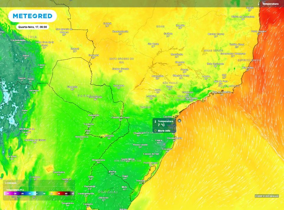 Contudo, as temperaturas mínimas ficam mais baixas em localidades das Serras gaúcha e catarinense, que são áreas mais elevadas, onde elas oscilam entre 7°C e 9°C.