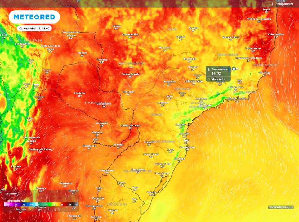 O alívio ao calorão dos últimos dias também será sentido no Sudeste nesta quarta-feira (17), pois o sistema também vai diminuir as temperaturas em parte da região, embora a frente fria ainda cause chuvas na faixa litorânea entre o Rio de Janeiro e o Espírito Santo e favoreça instabilidades em Minas Gerais