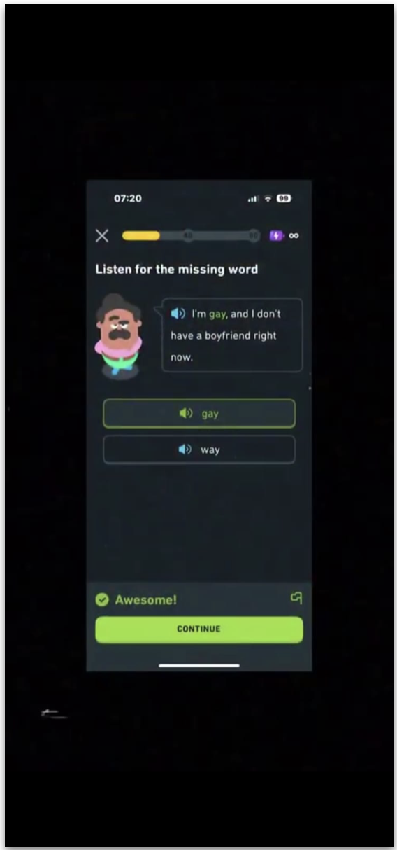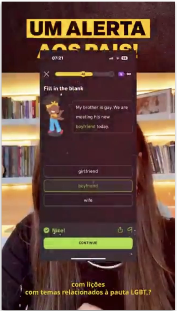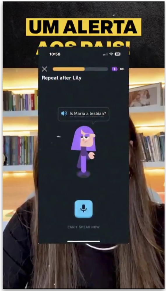 Para fundamentar suas críticas, De Toni exibiu capturas de tela de exercícios do aplicativo. Entre os exemplos citados estavam frases como “Meu irmão é gay. Nós vamos conhecer o namorado dele hoje”, “A Maria é lésbica?” e “Eu sou gay e não tenho um namorado agora”, todas inseridas em atividades de tradução.