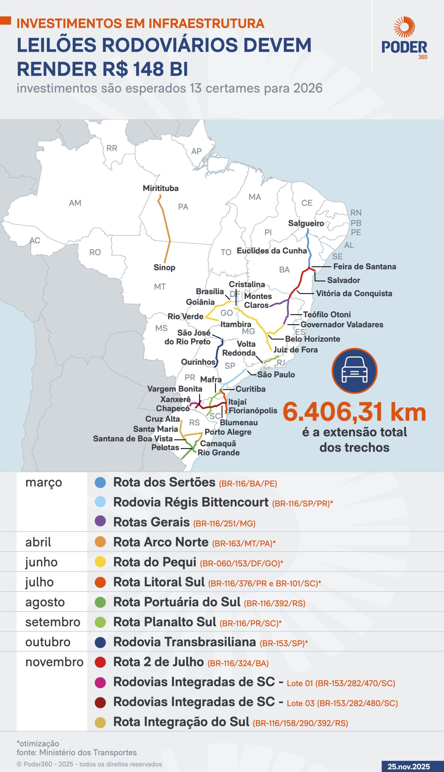 A concessão das Rotas Gerais integra a carteira de rodovias que o governo federal pretende levar a leilão no próximo ano. O Ministério dos Transportes projeta 13 concessões rodoviárias no próximo ciclo, com expectativa de R$ 148 bilhões em investimentos, combinando novos trechos e projetos de otimização de contratos existentes.