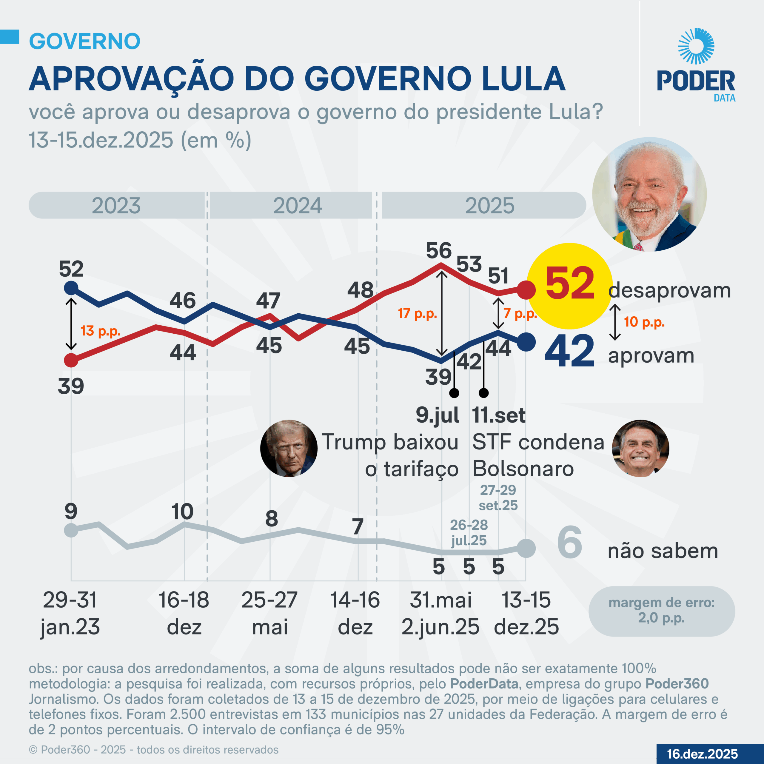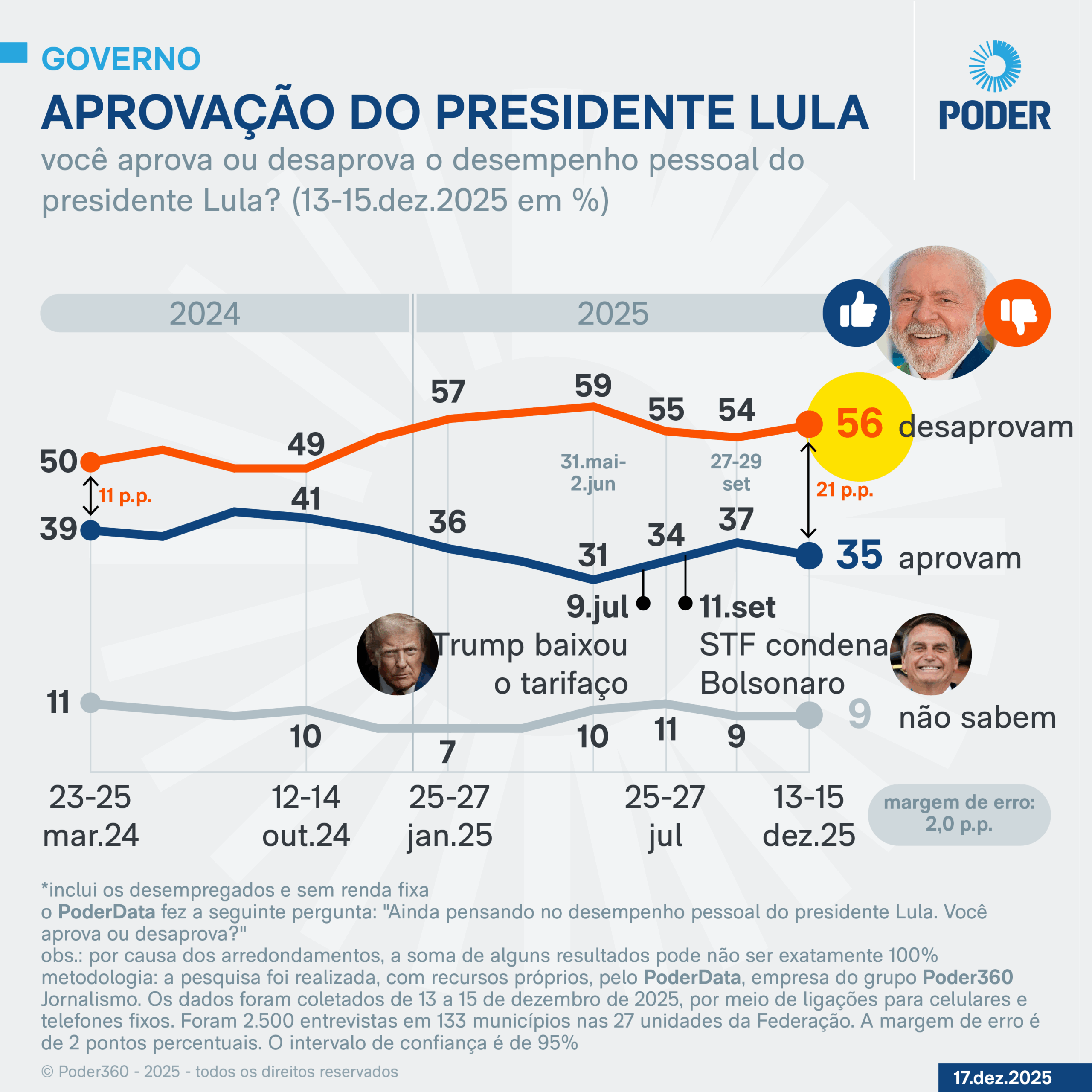 A pesquisa foi realizada pelo PoderData, empresa do grupo Poder360 Jornalismo, com recursos próprios. Os dados foram coletados de 13 a 15 de dezembro de 2025, por meio de ligações para celulares e telefones fixos. Foram 2.500 entrevistas em 133 municípios nas 27 unidades da Federação. A margem de erro é de 2 pontos percentuais. O intervalo de confiança é de 95%.