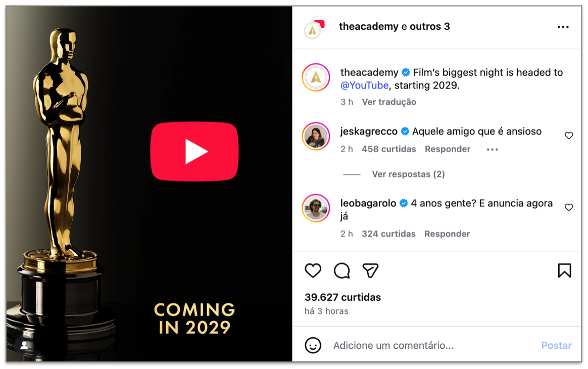 A partir de 2029, o YouTube será o responsável pelos direitos de exibição do Oscar até 2033. A plataforma será o principal destino do conteúdo relacionado à premiação incluindo a cobertura do tapete vermelho, o Governors Awards e os anúncios dos indicados.