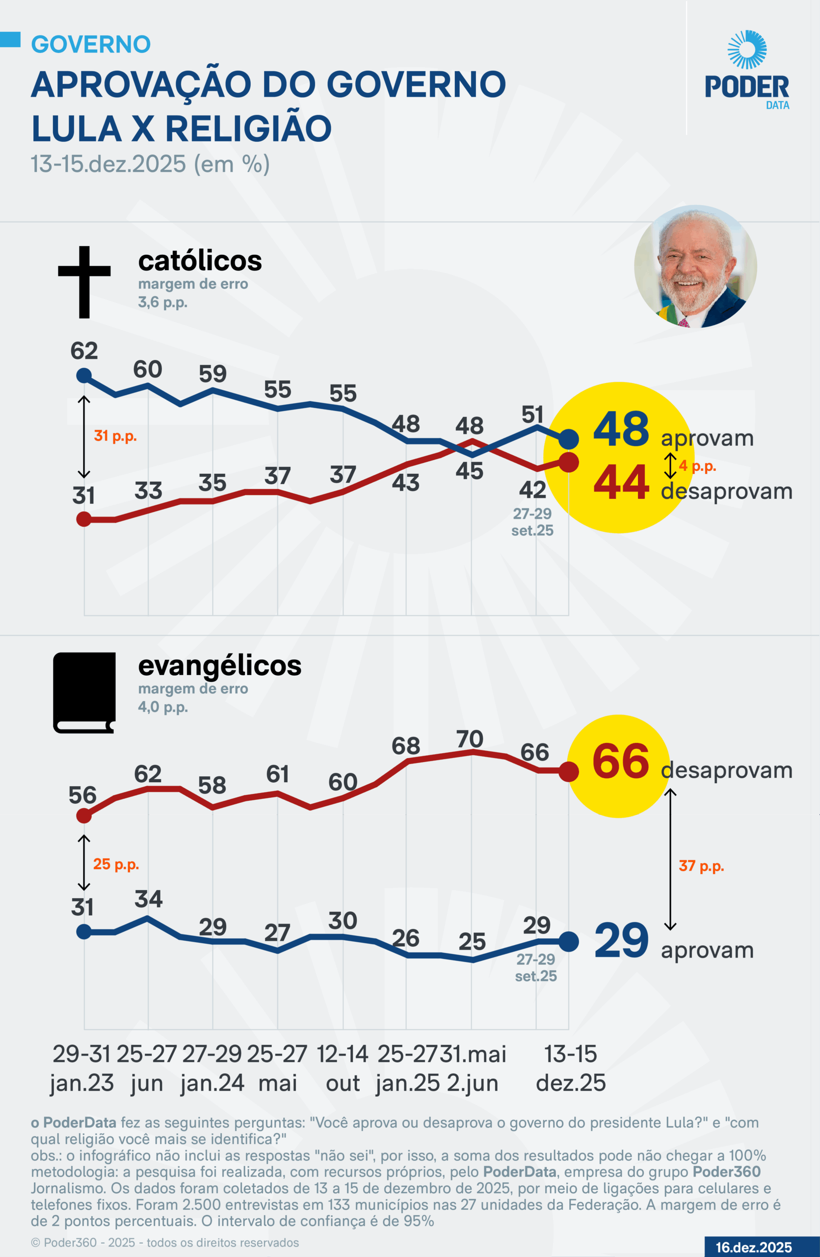 Entre os eleitores evangélicos, as taxas se mantiveram inalteradas: 66% desaprovam e 29% aprovam a administração federal.