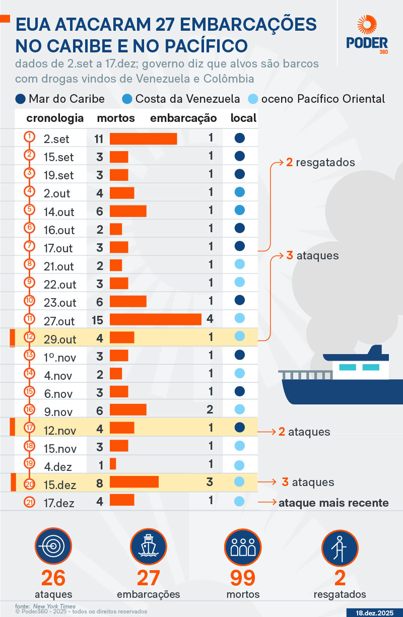Ainda na 4ª feira (17.dez), o Congresso dos EUA rejeitou uma medida liderada pelos democratas que tentaria restringir a campanha do governo Trump contra barcos suspeitos de transportar drogas.